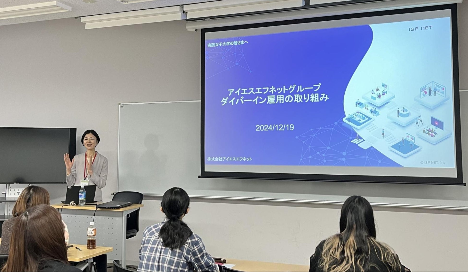 株式会社アイエスエフネット(本社:東京都港区/代表取締役:渡邉幸義、以下アイエスエフネット)と実践女子大学(東京都日野市、学長:難波雅紀)は、2024年12月19日(木)、最高ダイバーイン雇用責任者(CDIO)の元村里恵とマーケティング本部 副本部長の上沖沙恵が、社会連携の一環として実践女子大学渋谷キャンパス(東京都渋谷区)で特別授業を行いました。