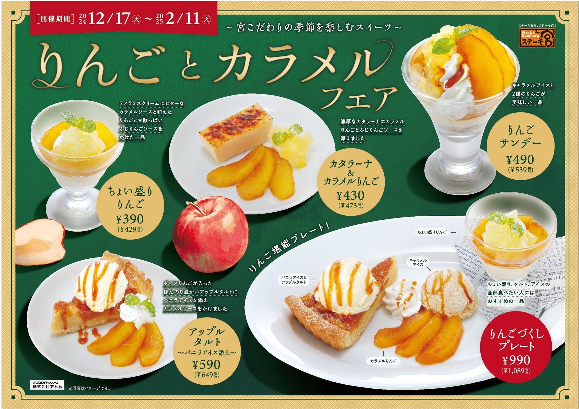 コロワイドグループの株式会社アトム(本社:神奈川県横浜市、代表取締役社長:田中公博)は、「ステーキ宮」112店舗で、2024年12月17日(火)~2025年2月11日(火)の期間限定で「りんごとカラメルフェア」を実施いたします。