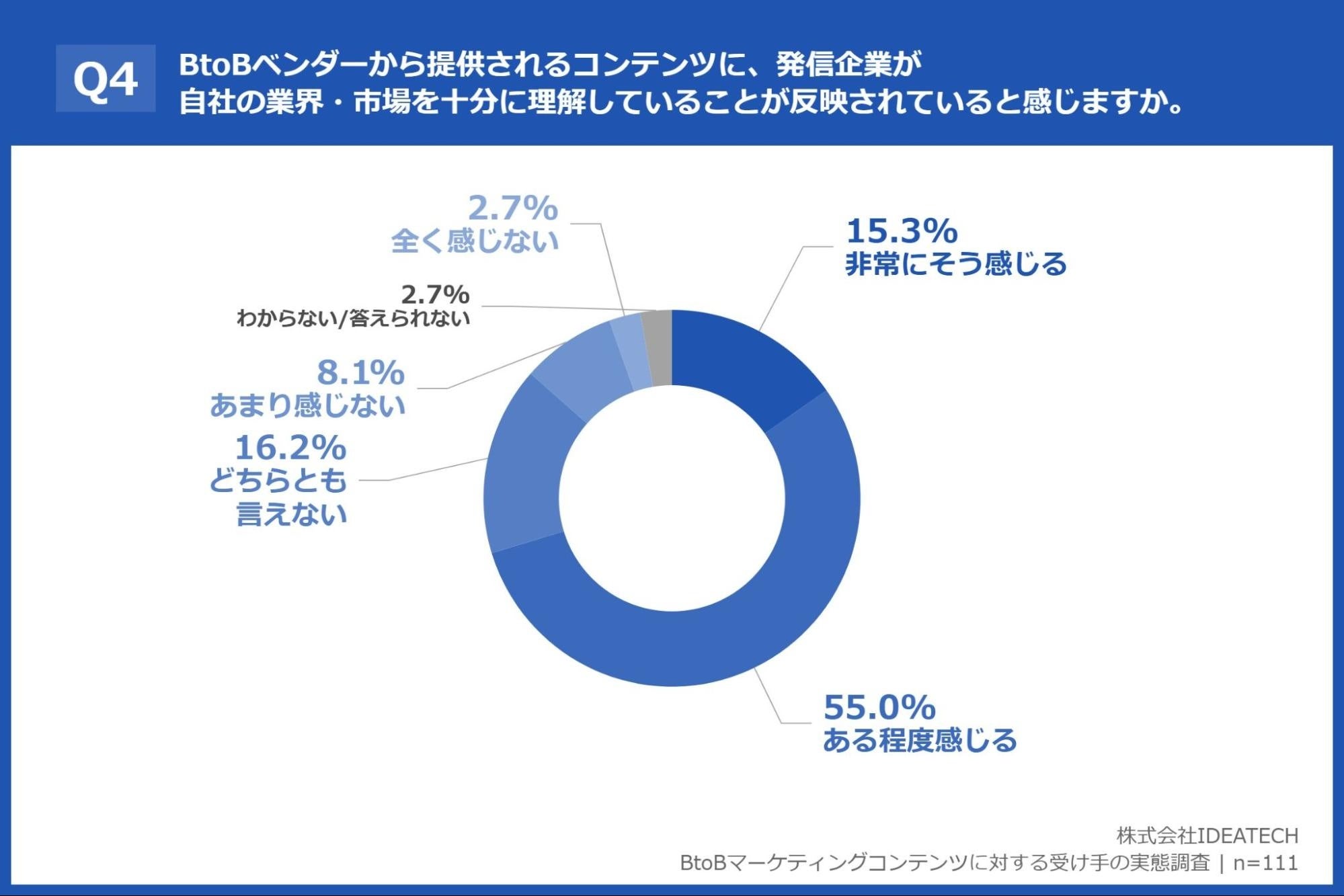 「Q4. BtoBベンダーから提供されるコンテンツに、発信企業が自社の業界・市場を十分に理解していることが反映されていると感じますか。」(n=111)と質問したところ、「非常にそう感じる」が15.3%、「ある程度感じる」が55.0%、「どちらとも言えない」が16.2%という回答となりました。