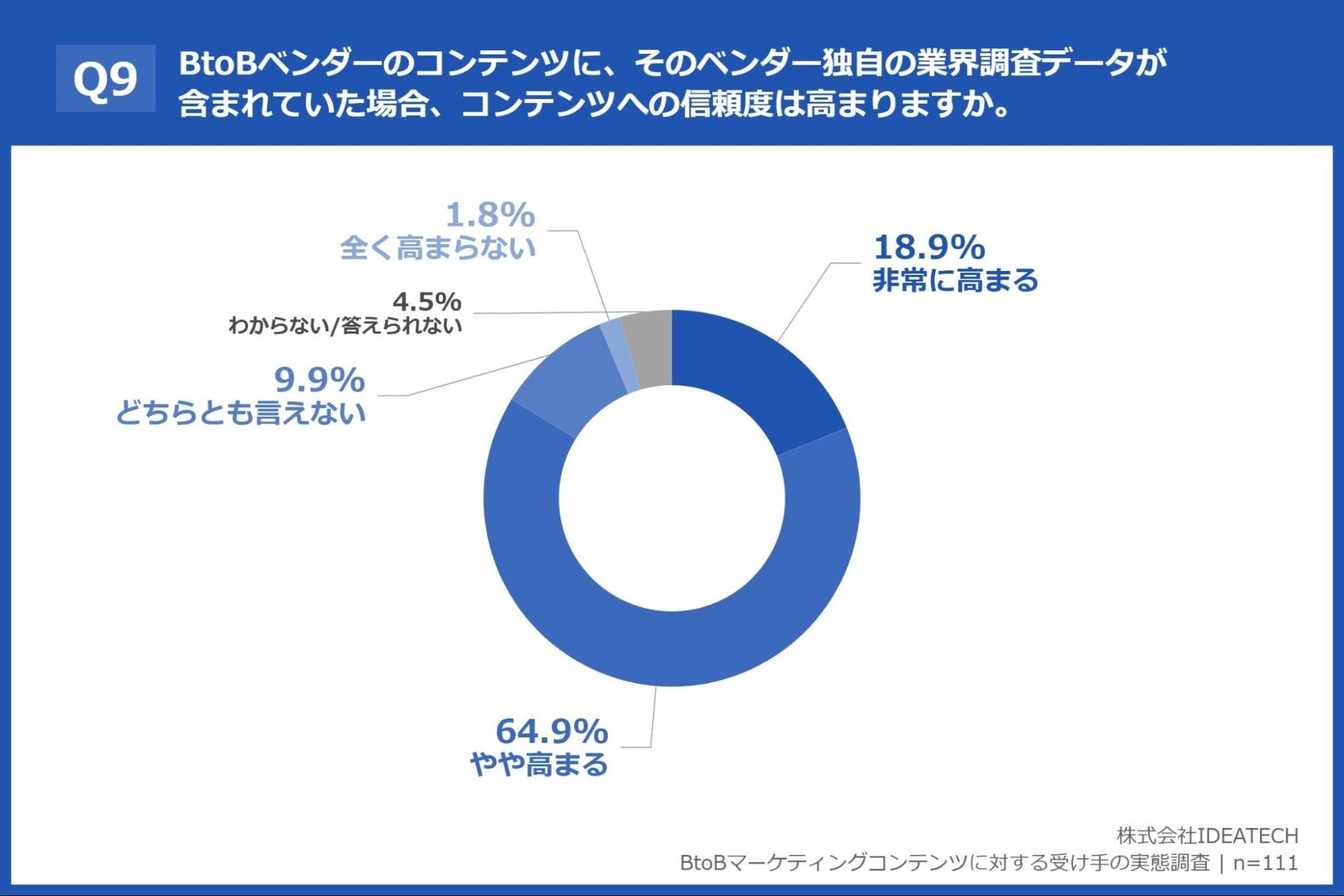 「Q9. BtoBベンダーのコンテンツに、そのベンダー独自の業界調査データ(同業他社の実態や課題を数値化したもの)が含まれていた場合、コンテンツへの信頼度は高まりますか。」(n=111)と質問したところ、「非常に高まる」が18.9%、「やや高まる」が64.9%、「どちらとも言えない」が9.9%という回答となりました。