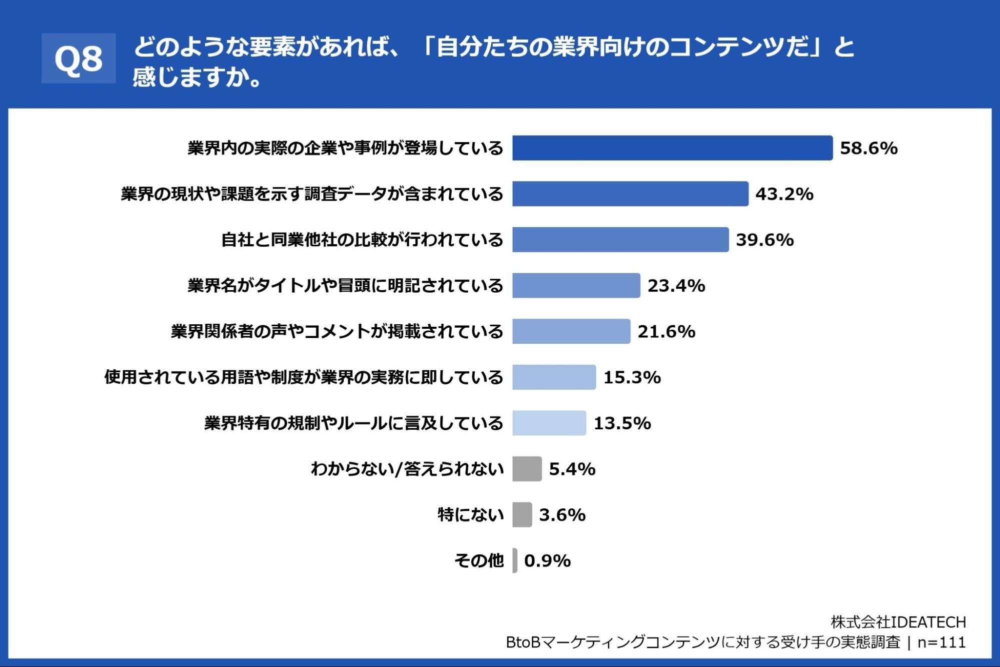 「Q8. どのような要素があれば、「自分たちの業界向けのコンテンツだ」と感じますか。(複数回答)」(n=111)と質問したところ、「業界名がタイトルや冒頭に明記されている」が23.4%、「業界内の実際の企業や事例が登場している」が58.6%、「業界の現状や課題を示す調査データが含まれている」が43.2%という回答となりました。