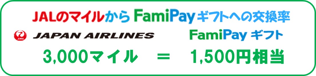 株式会社ファミリーマート(本社:東京都港区、代表取締役社長:細見研介、以下「ファミリーマート」)が提供する、ファミマのアプリ「ファミペイ」(以下:「ファミペイ」)に、特定のギフトコードを入力するとFamiPay残高へのチャージが可能になる「FamiPayギフト」と、日本航空株式会社(本社:東京都品川区、代表取締役社長:赤坂祐二、以下「JAL」)が提供する、マイレージサービス「JALマイレージバンク」との交換サービスにつきまして、現状の10,000マイルからの交換に加え、3,000マイルからの交換を、2022年4月1日(金)より開始することをお知らせいたします。