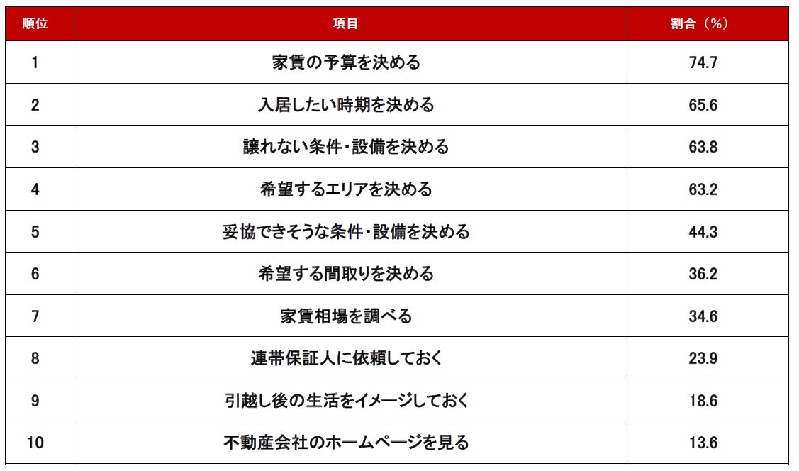 続いて2位は「入居したい時期を決める」でした。不動産会社からは「入居時期により紹介する物件が変わってくるため」といったコメントが寄せられました。入居したい時期まで時間がある場合は、一定期間家賃が発生しない「フリーレント」がついている物件を選ぶと、初期費用を抑えて入居することができます。