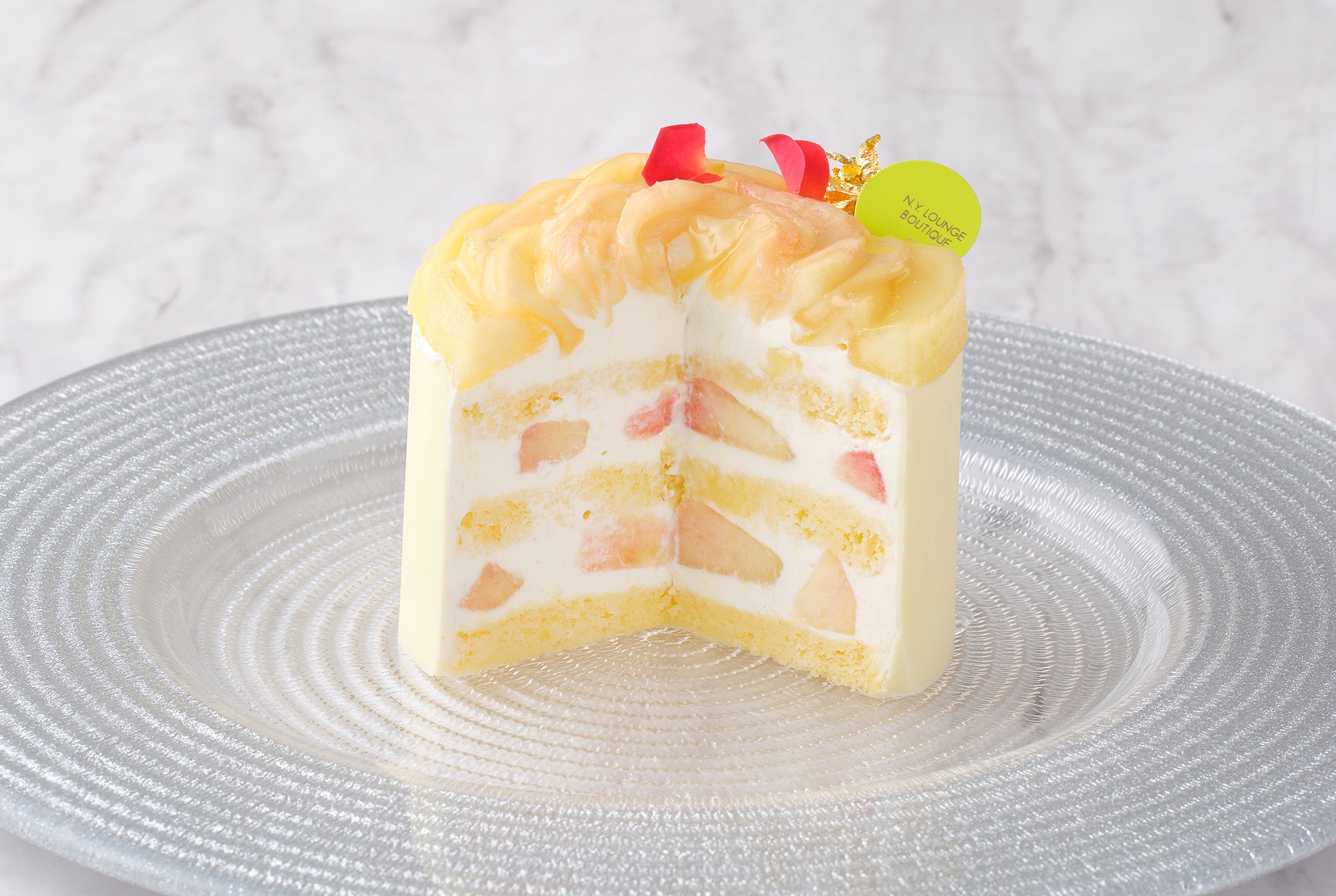 プレミアムピーチショートケーキは、きめの細かいスポンジ生地に口どけの良い生クリームと厳選した国産の桃をたっぷりとサンドし、側面にホワイトチョコレートを巻き、トップにフレッシュな桃のスライスをバラの花のように飾り、華やかな装いに仕上げました。甘さ控えめのクリームとしっとりとした食感のスポンジが桃の繊細な香りと優しい甘さを引き立て、爽やかな味わいをお楽しみいただけます。