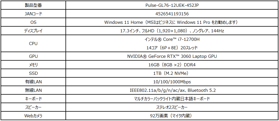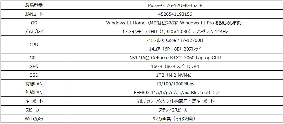 【Pulse-GL76-12UEK-452JPの主な特徴】