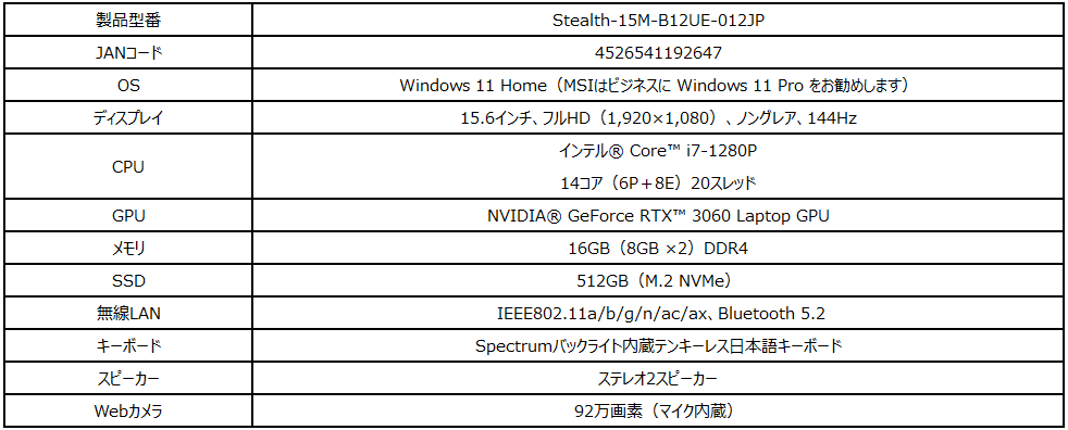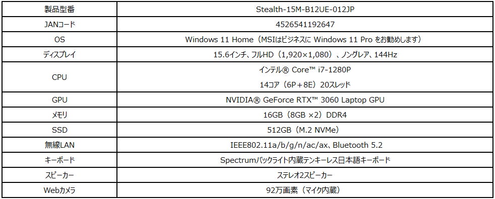 【Stealth-15M-B12UE-012JPの主な特徴】