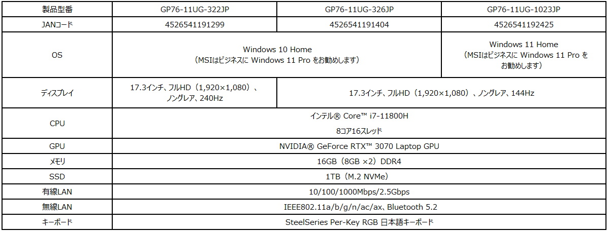 「GP76-11UG-1023JP」は、CPU「Core™ i7-11800H」とGPU「GeForce RTX™ 3070 Laptop GPU」を搭載し、Steam®版『モンスターハンターライズ:サンブレイク』をフルHD解像度・高画質・フレームレート100FPS以上※2の美しく・滑らかな映像で楽しめるハイスペックゲーミングノートPCです。高性能CPU・GPUの組み合わせは、「滑らか表示ディスプレイ(144Hz)」の性能を引き出すためにPCゲームを高フレームレートで動作させるゲーミング性能を発揮します。