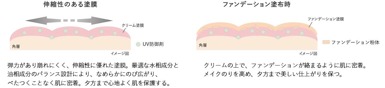 しなやかなシールド膜が肌を包み続け、日中のスキンケア効果と美しいツヤ肌仕上がりを実現