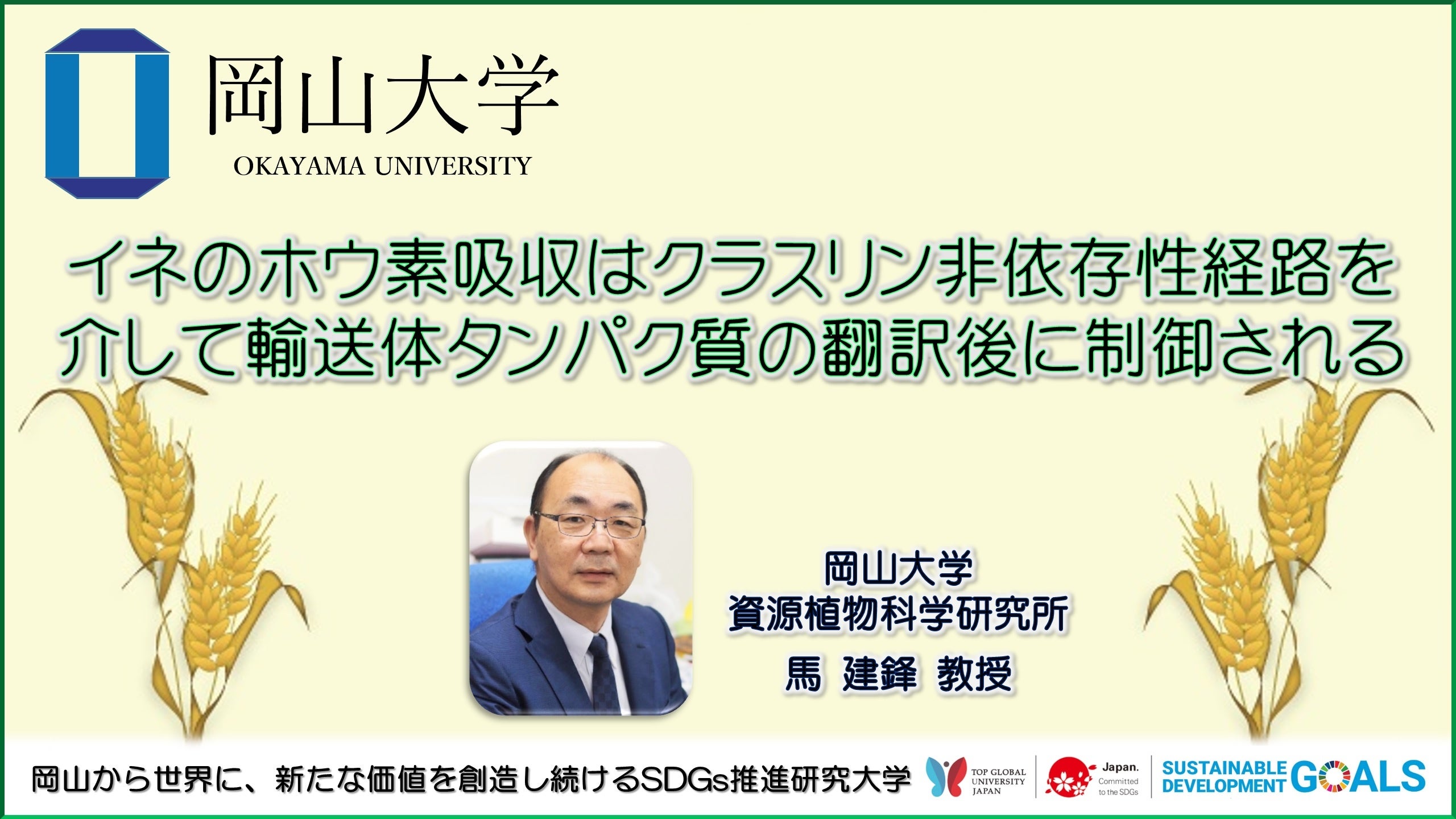 国立大学法人岡山大学(本部:岡山市北区、学長:槇野博史)の岡山大学資源植物科学研究所(IPSR)植物ストレス学グループの馬建鋒教授のグループは、イネのホウ素吸収はクラスリン非依存性経路を介して輸送体タンパク質の翻訳後に制御されることをつきとめました。