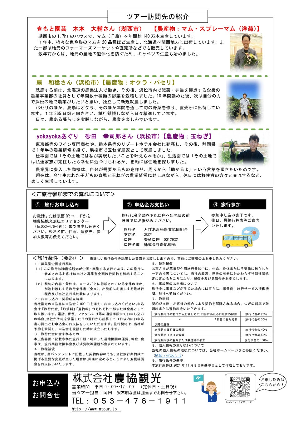 静岡県に移住して農業を始められたい方におすすめの体験ツアーです。浜松市・湖西市の農場訪問、先輩移住者との座談会を行います。就農の経緯や、各市の移住施策の説明を聞くことができます。