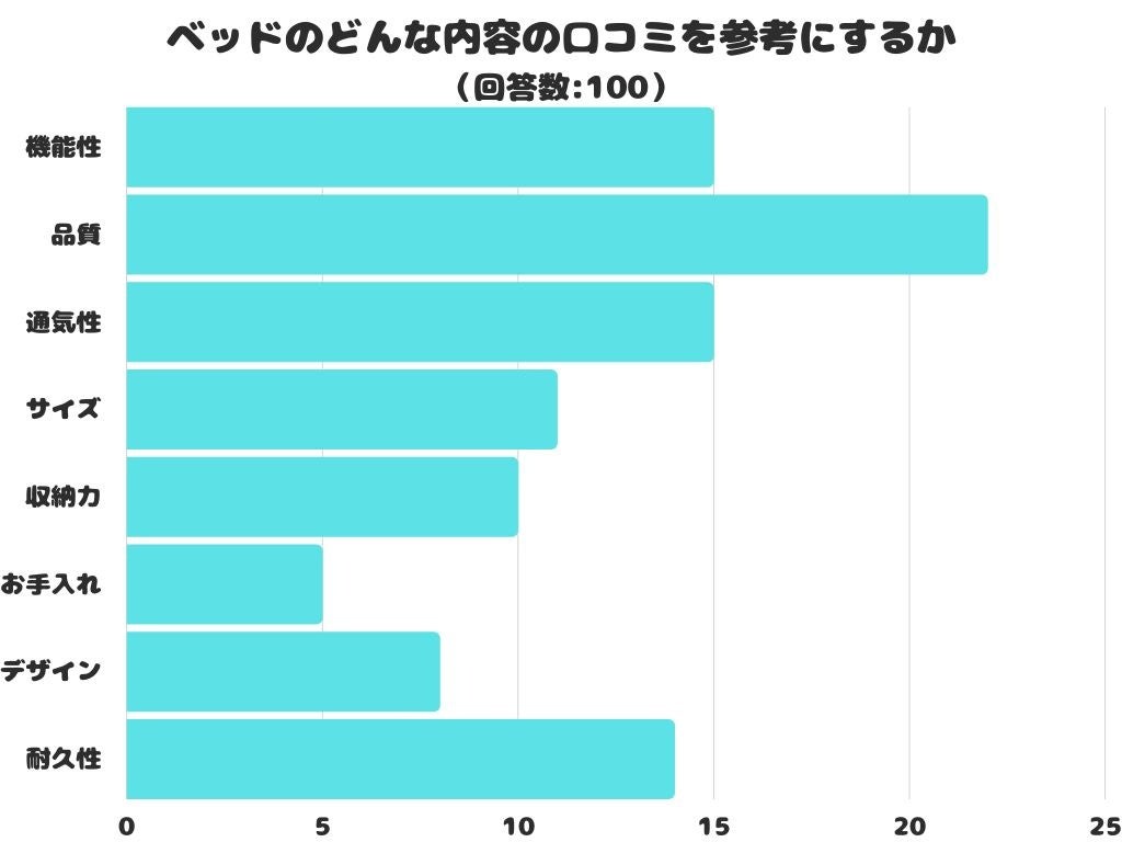 ベッドのどんな内容の口コミを参考にするかをアンケートにて調査したところ、1位は「品質」でした。