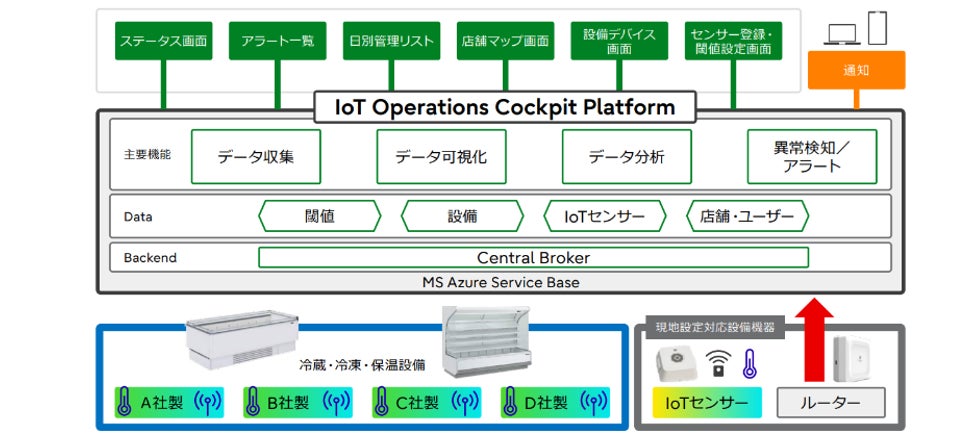 これにより、ベイシアの店舗内で実施される冷蔵・冷凍設備の温度の点検・記録業務が自動化されHACCP(Hazard Analysis and Critical Control Point)(注3)対応における店舗従業員の作業を大幅に効率化するとともに、閾値を超えた異常を検知した際にはアラート通知がなされ商品鮮度管理を強化し、食品ロス削減に貢献します。