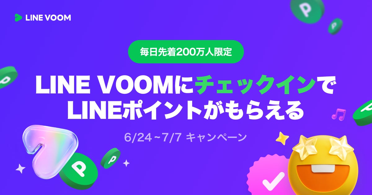 LINE ヤフー株式会社は、「LINE」内のショート動画プラットフォーム「LINE VOOM」にて、2024年6月24日(月)より、毎日先着200万人にLINEポイントをプレゼントするキャンペーンを開催します。