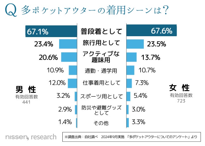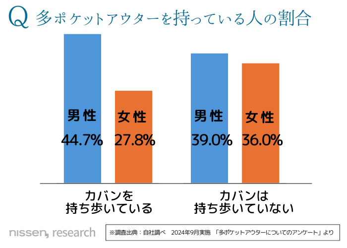 『女性の9割以上が、ちょっとした外出でもカバンを持つ。女性の多ポケットアウター保有率は3割未満と低い。』 ・近所への気軽な外出時に”カバンを持ち歩いている”率は、女性91%、男性64%。 ・ポケットの数が多いアウターの保有に関しては、男性の42.7%が”持っている”と回答。 女性よりも男性の方が保有率が高い結果。 ・多ポケットアウターを持っている女性は、カバンを持ち歩かない人の1.3倍、カバンを持ち歩かない 「手ぶら派」の方が多い。 ・多ポケットアウターの着用シーンは、1位から3位まで男女ともに同傾向。1位”普段着”、2位”旅行用”、 3位”アクティブな趣味用”。 |