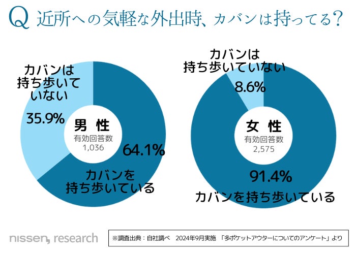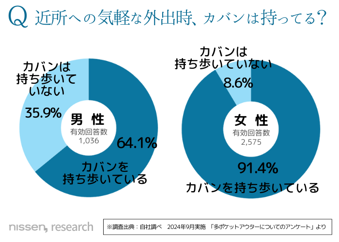今回の調査では、近所へのちょっとしたお出かけに”カバンを持っている”という回答が、手ぶら派よりも多い結果となりました。特に女性でその傾向が強く、手ぶら派は1割にも満たない結果となりました。