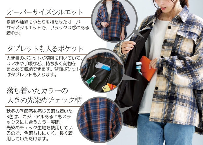 商品名:多ポケット先染めチェックシャツジャケット(ハンズフリー)