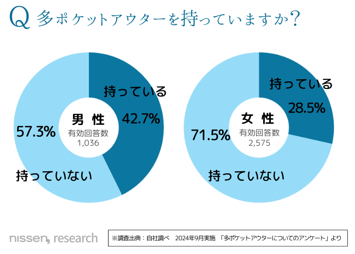 独自調査:女性の保有率3割以下と、まだまだ低い多ポケットアウター。脅威の収納力で昨年完売した話題のアウターがバリエーション拡大!手ぶらで気軽にお出かけできて、旅行でも防災でも役立ちます。