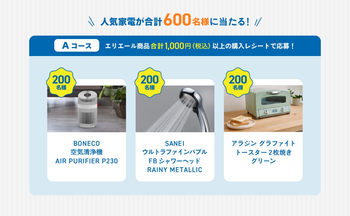 ◎Aコース(抽選:各200名さま):1,000円以上の購入レシートで応募可