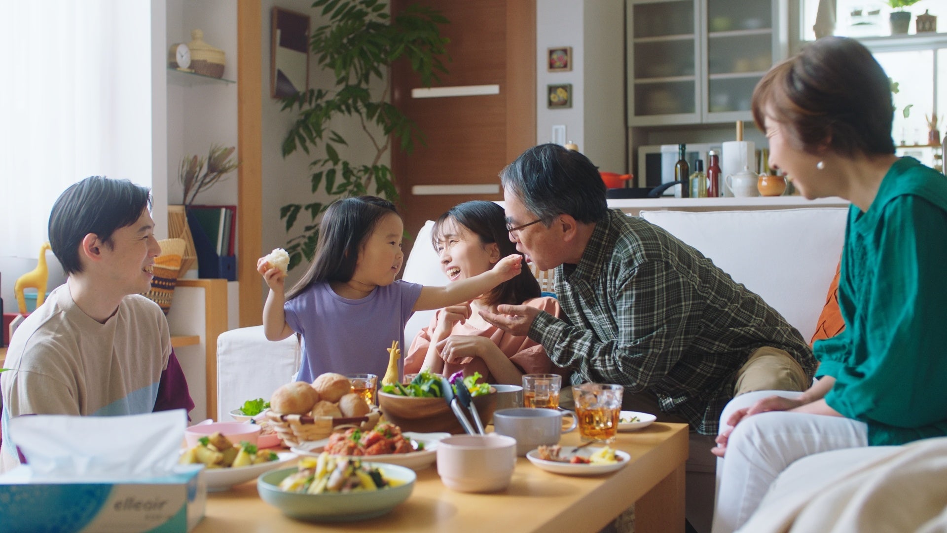今回のCMでは、楽しげな家族の食卓や一緒に鼻かみの練習をする親子の姿、休日に映画を観て感動する女性など、何気ない“しあわせの形”といつもそこに寄り添うエリエール商品の姿を描くことで、『毎日のこと、やっぱり、いいものを。』というメッセージを表現しています。