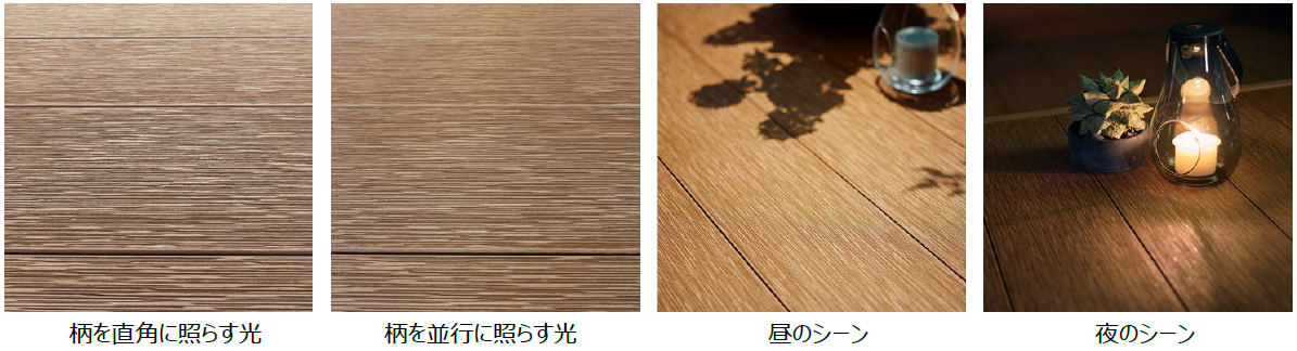 硬木調の柾目柄が生み出すランダムで深い溝が光の当たり方や眺める角度によってさまざまな木目の表情を演出します。同じ時間でも柄を直角に照らす光は溝が深く色が濃く見え、並行に照らす光では溝が浅く色が薄く見えます。昼と夜でもナチュラルにもシックにも変化し、おうち時間を充実させる庭空間を演出します。