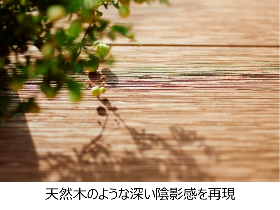 硬木調・柾目柄の木肌による高級感と「リウッドデッキ 200」の耐久性能を両立