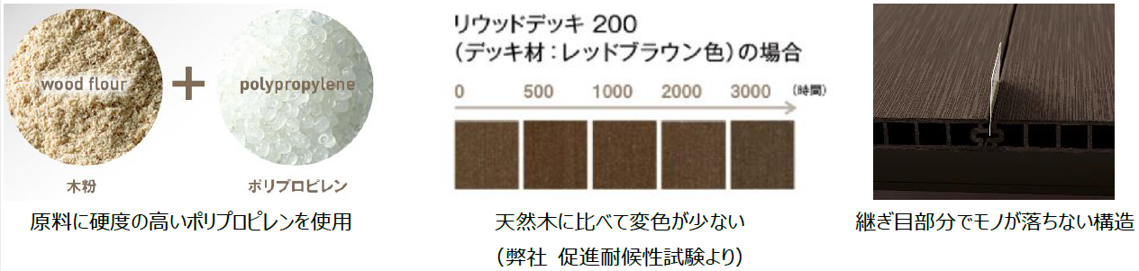 | 材質 | デッキ材、幕板:木材、プラスチック再生複合材 下地構造部(束柱・大引き等):アルミニウム(※2) |