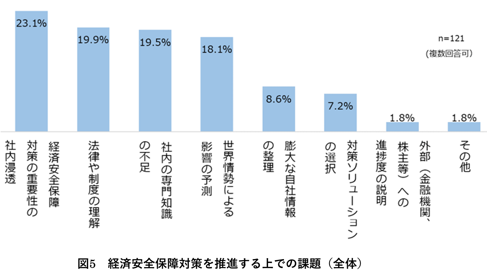 経済安全保障対策を社内で進める上での課題については、「経済安全保障対策の重要性の社内浸透」や、「法律や制度の理解」、「社内の専門知識不足」など、経済安全保障に関する理解や知見に関する項目に多くのポイントが集まり、「自社情報の整理」や、「対策ソリューションの選択」、「外部への進捗度の説明」などの具体的活動への課題が感じられている割合は低いという結果となりました。