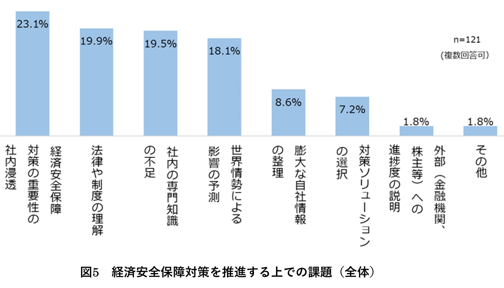 進捗が不十分という回答が多かったのは、前項の「経済安全保障対策を進める上での課題」でも示されたように、現状では理解や知見の獲得の段階にある企業が多い傾向にあり、具体性のある対策や、平時の企業活動に組み込まれている状態に至っている企業はまだ多くはないという状況が反映された結果であると考えられます。