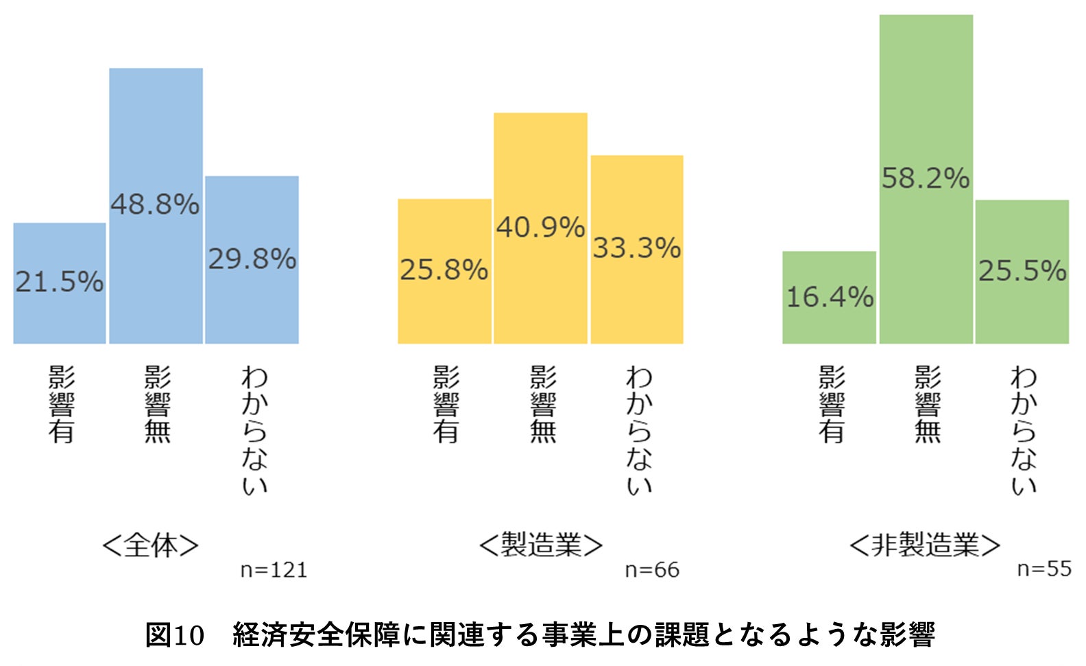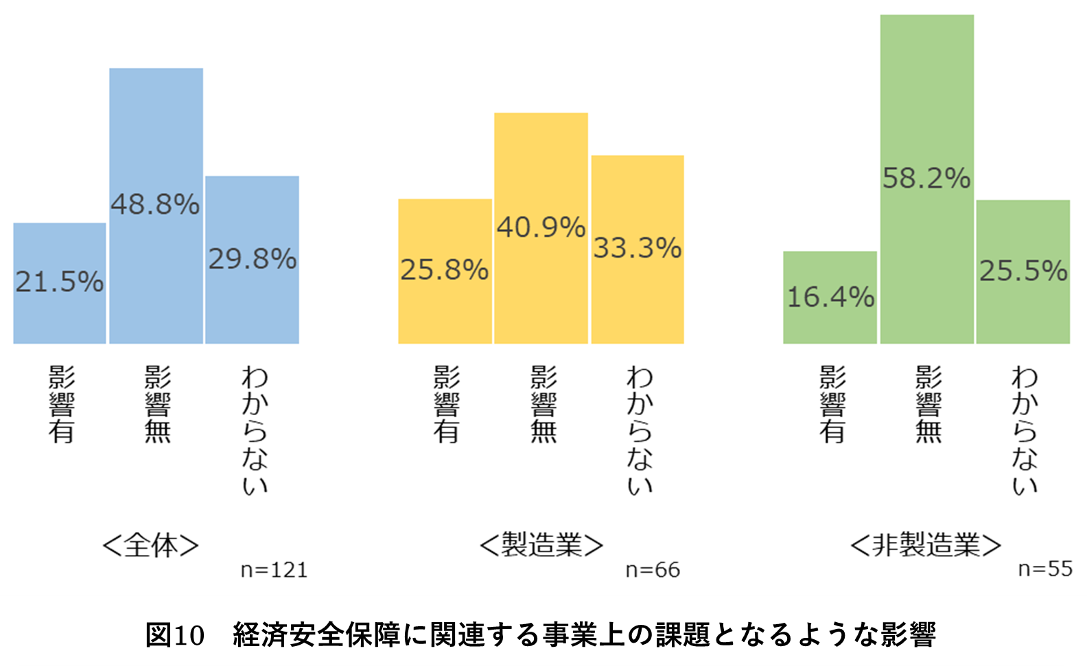 全体で約2割の回答者が経済安全保障に関連する事業上の課題となるような影響の有無について、「影響有」と回答しました。製造業のほうが非製造業より約10ポイント「影響有」と回答した割合が高く、また非製造業では「影響無」という回答が約6割を占めました。