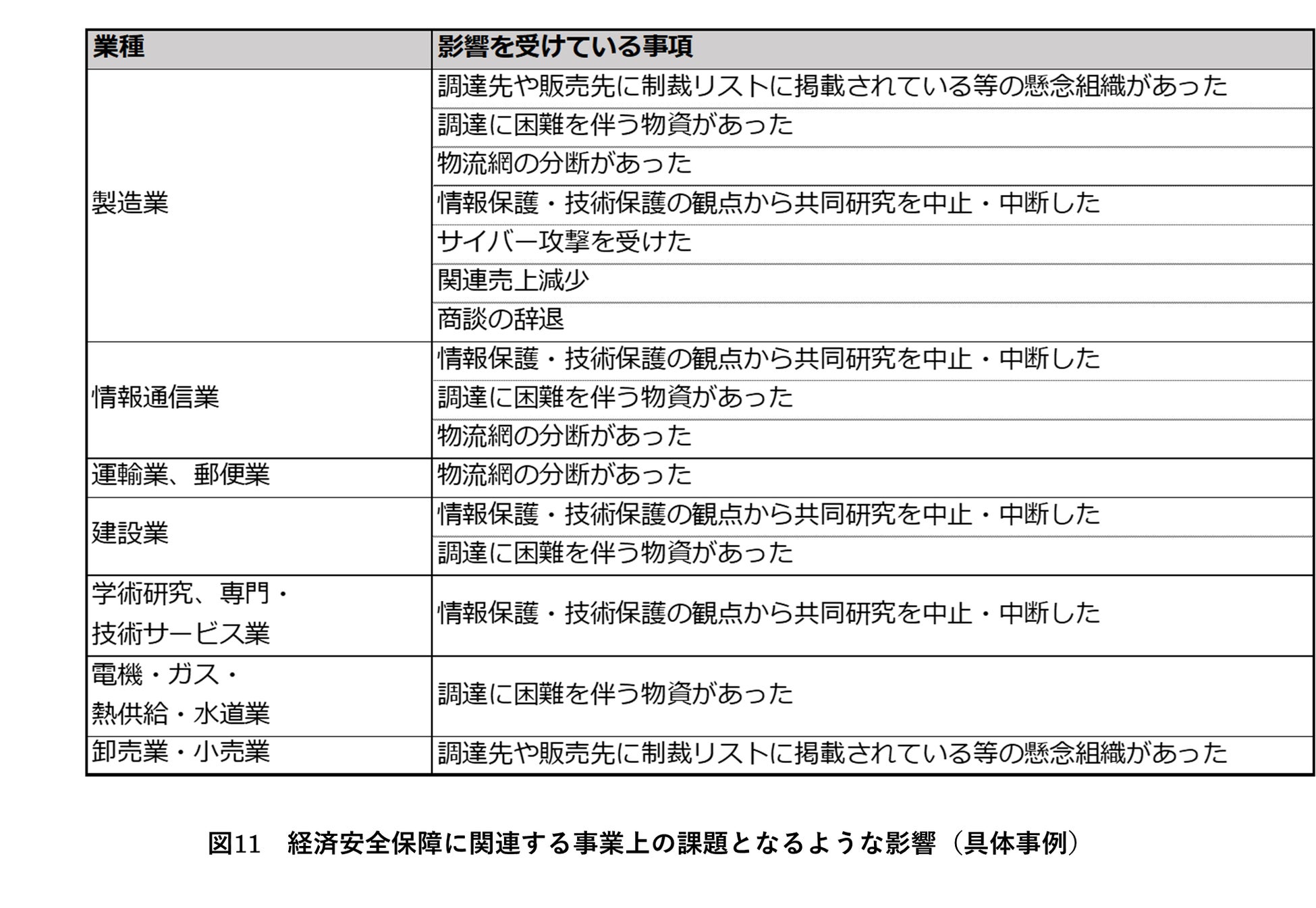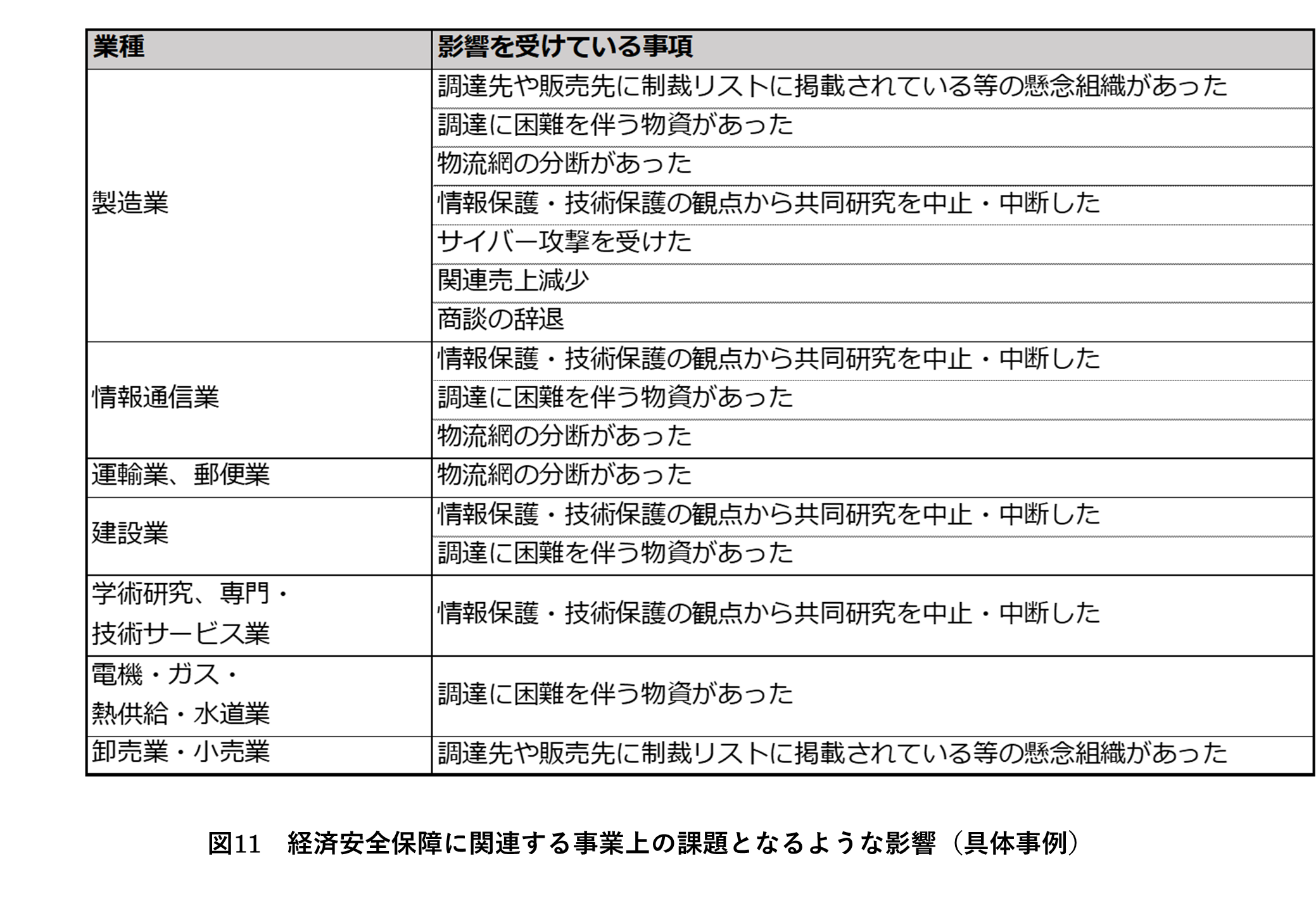 影響を受けた具体的な内容としては、「調達先や販売先に制裁リストに掲載されている等の懸念組織があった」や、「調達に困難を伴う物資があった」、「情報保護・技術保護の観点から共同研究を中止・中断した」、「物流網の分断があった」などが挙がり、業種を問わず事業上の課題となる影響を受けていることが明らかになりました。