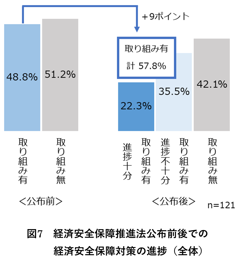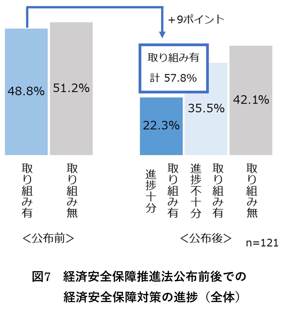 経済安全保障対策の進捗について、経済安全保障推進法の公布前後での対策の有無と進捗の程度を確認しました。全体また、製造業と非製造業のいずれでも法律公布前から比較すると、公布後に取り組みが行われている企業が増えていることがわかりました。