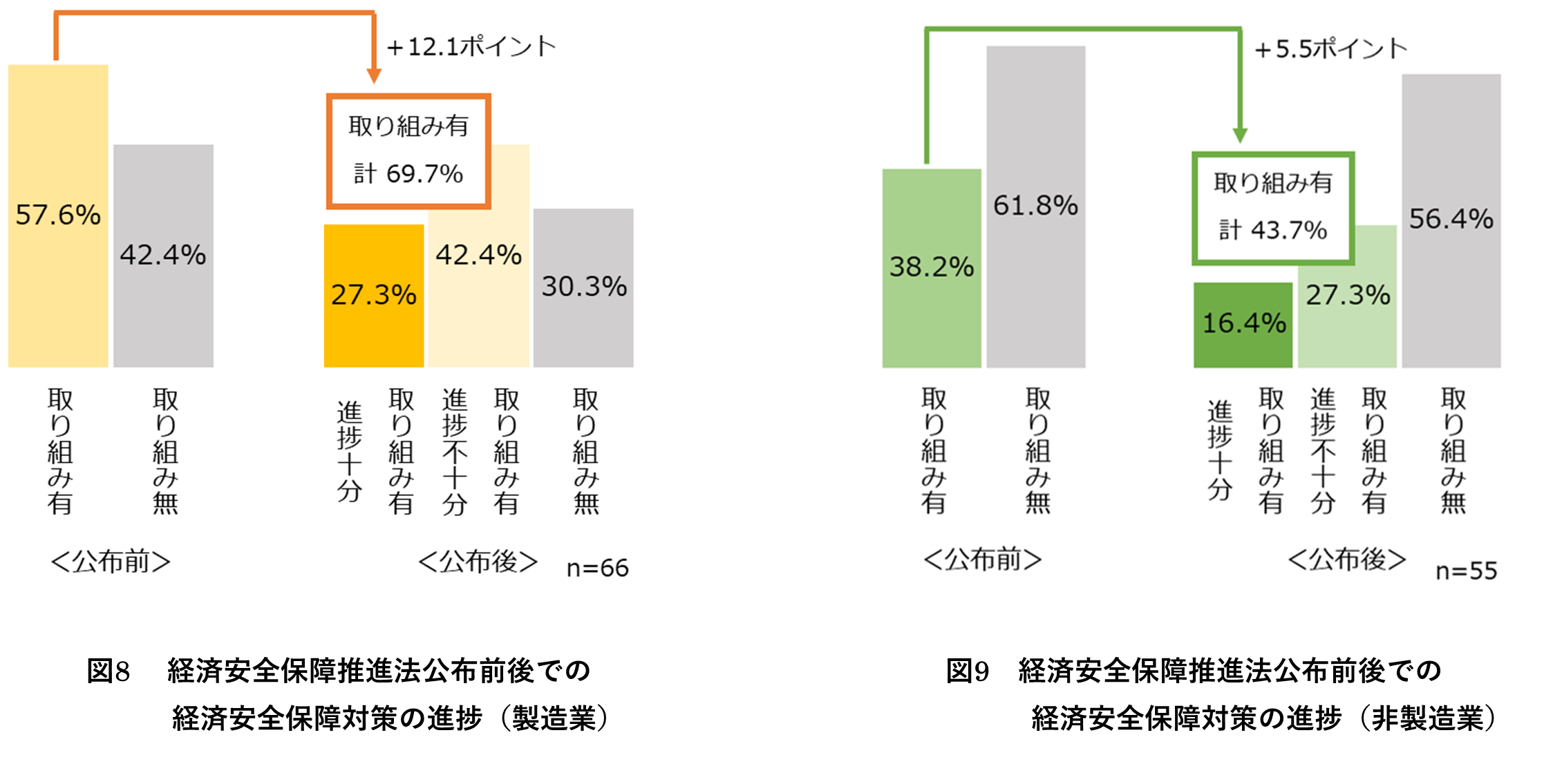 製造業と非製造業で分解して比較すると、製造業のほうが公布前から取り組みを開始している企業の割合が高かったことに加え、公布後の取り組み企業の割合も12.1ポイント増となり、非製造業では5.5ポイント増であることから比較しても、製造業における経済安全保障対策の取り組みは他業種に先んじていることがわかります。