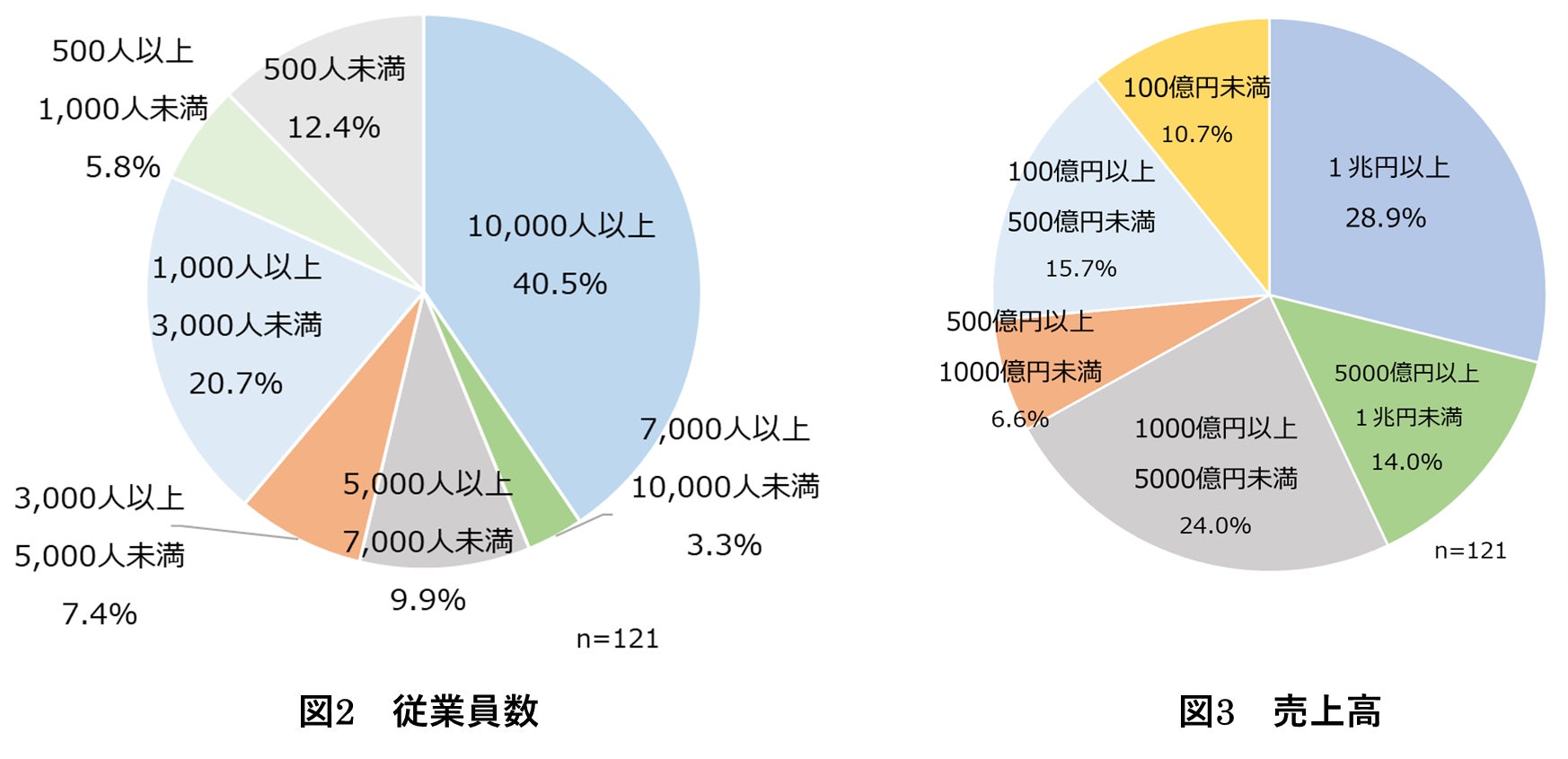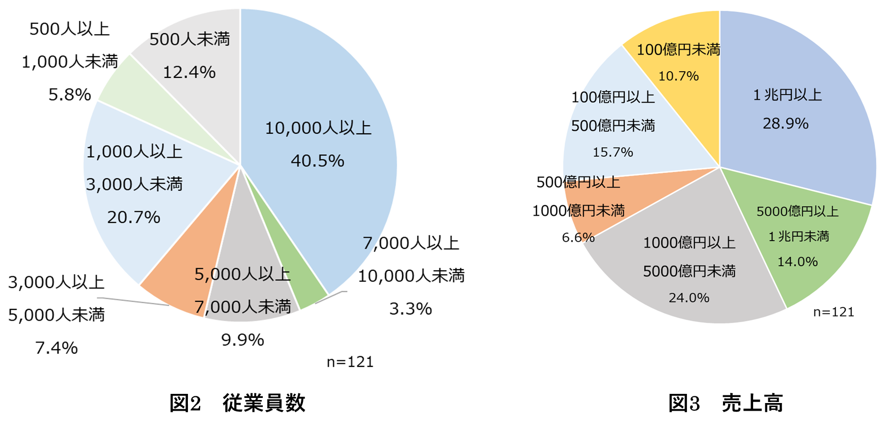 回答者の業種は多岐にわたるものの、約5割が製造業に携わる方でした。本調査は、FRONTEO主催の「経済安全保障勉強会」等にご参加・ご関心をいただいている日本企業所属の方に対して行ったため、サプライチェーンマネジメント等に関心の高い製造業の方が多くなりました。企業規模については、従業員数10,000人以上の企業が4割を超えました。また、売上高は1兆円を超える企業が約3割、1000億円を超える企業が約7割という結果でした。