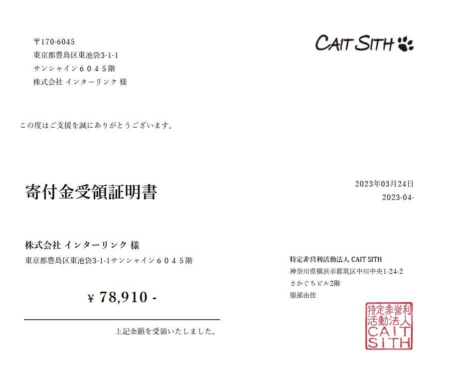 上級者向け(使う人のあまりいない)の特殊な(微妙な)サービスを提供する、インターネットサービスプロバイダーの株式会社インターリンク(東京都豊島区、代表取締役:横山正)は、社会貢献活動の一環として、保護猫活動団体の特定非営利活動法人CAIT SITHへ78,190円を寄付したことをご報告致します。