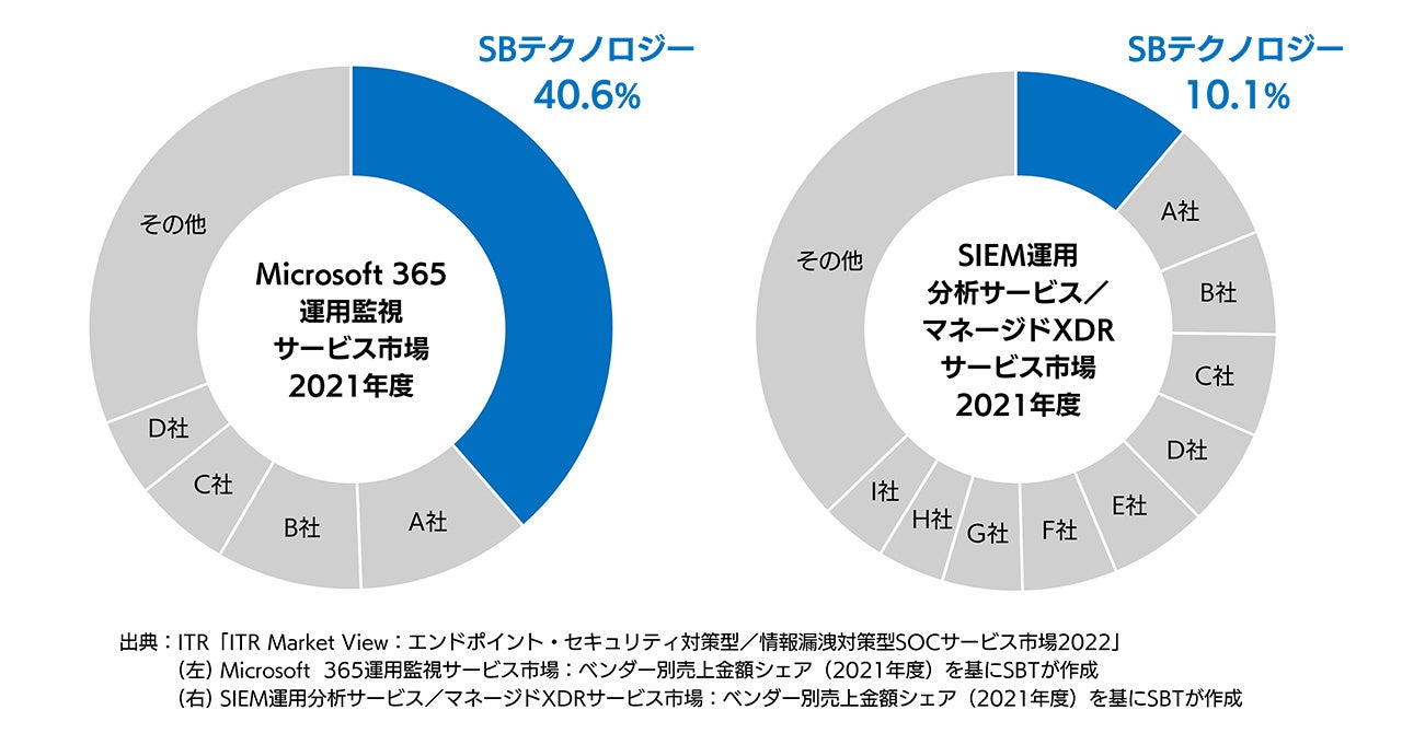 SBテクノロジー株式会社(本社:東京都新宿区、代表取締役社長 CEO:阿多 親市、以下 SBT)は、株式会社アイ・ティ・アール(以下 ITR)が2023年1月に発行した「ITR Market View:エンドポイント・セキュリティ対策型/情報漏洩対策型SOCサービス市場2022」の6分野のうち、Microsoft 365運用監視サービス及びSIEM運用分析サービス/マネージドXDRサービスの2分野において、2021年度ベンダー別売上金額シェア1位を獲得しました。