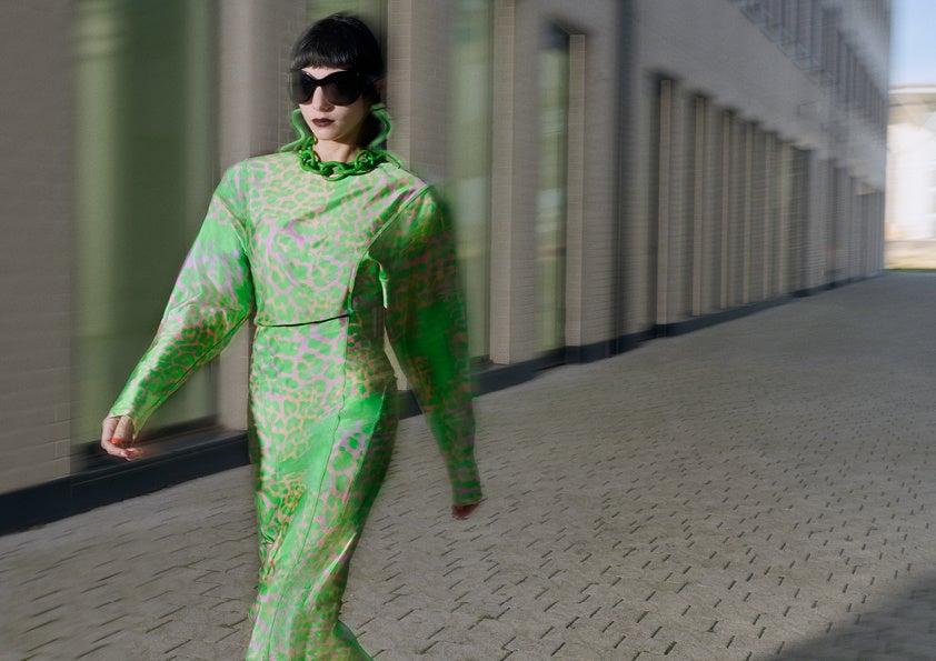 「本コレクションのプリントは、まさにファッションの祝宴です。特にレオパードのコラージュプリントは、まるでキャンディーバッグのように、さまざまなプリントを切り取って貼り合わせており、大胆かつシャープな印象を表しています。また、イラストレーターのStefan Fähler(ステファン・ファーラー)が描いたダイナミックなリップ・モチーフのプリントは、悦楽的なムードを表現しています」(H&M Studio プリント・デザイナー、モア・バートリング)