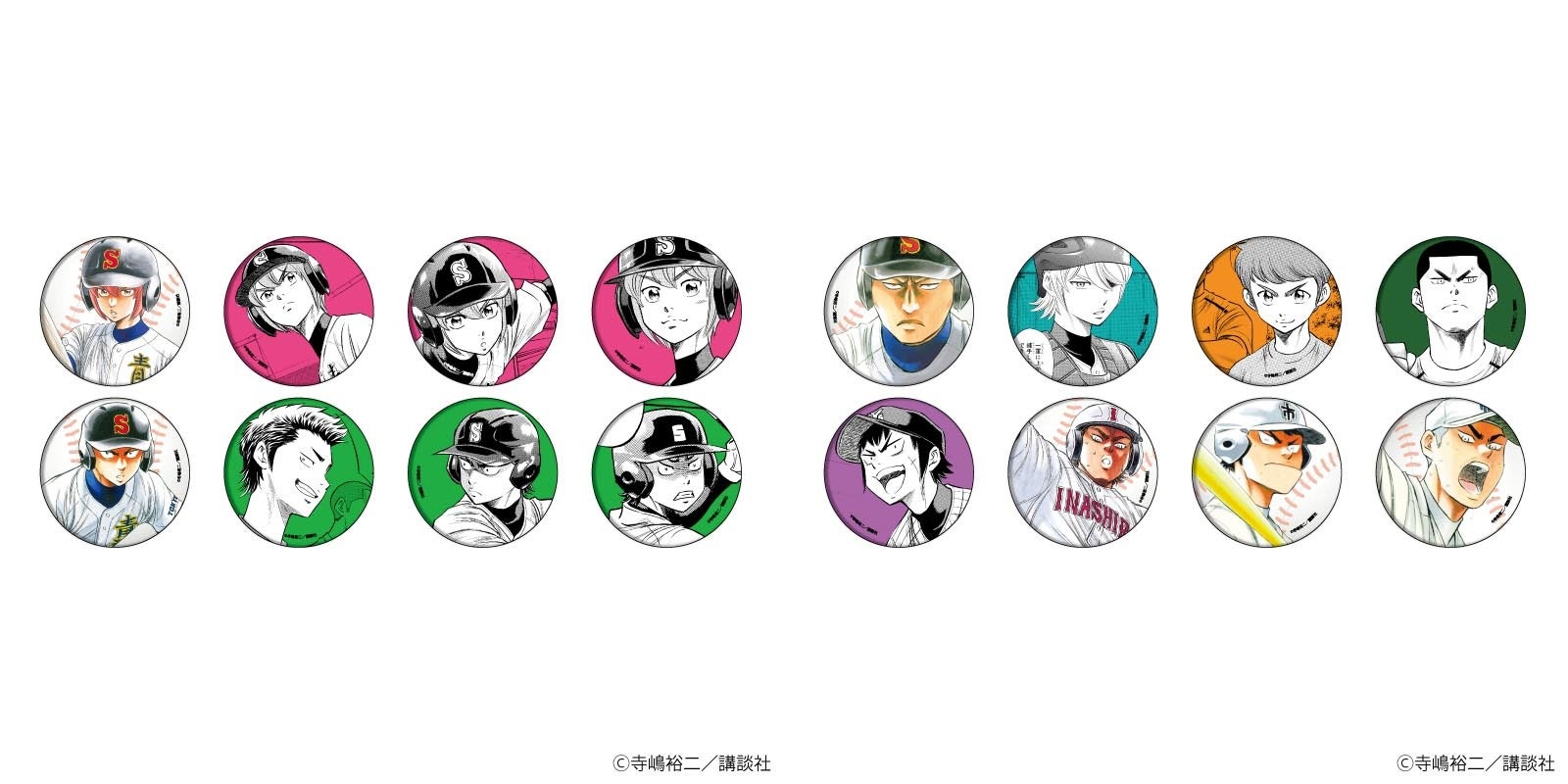 缶バッジには、沢村栄純、降谷暁、御幸一也、小湊春市、倉持洋一を中心に、青道高校や他校のキャラクターたちも登場。