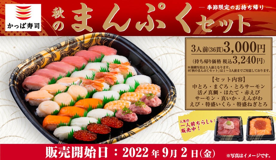 まもなく食欲の秋到来!人気ネタがたっぷり入ったボリューム満点の『秋のまんぷくセット』をお持ち帰りいただき、秋の行楽にも、ご自宅でもかっぱ寿司のお寿司をお楽しみください。