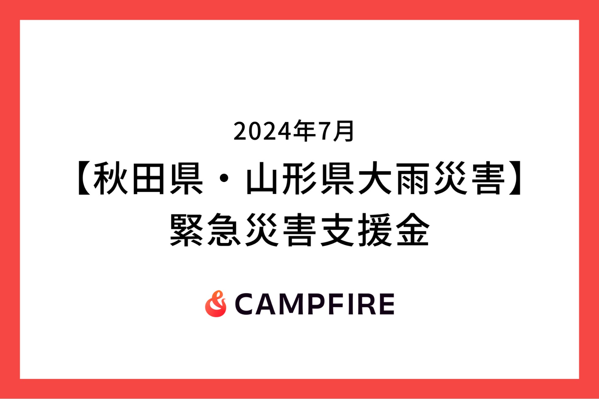 株式会社CAMPFIRE(本社:東京都渋谷区 / 代表取締役:家入 一真 )は、2024年7月25日の大雨により、秋田県・山形県を中心に被災された方々の生活を支援するため、本日より緊急災害支援金の募集を開始します。集まった支援金は、支援先窓口が開設され次第、被災自治体への義援金として被災地域の方々へ届けることを予定しています。
