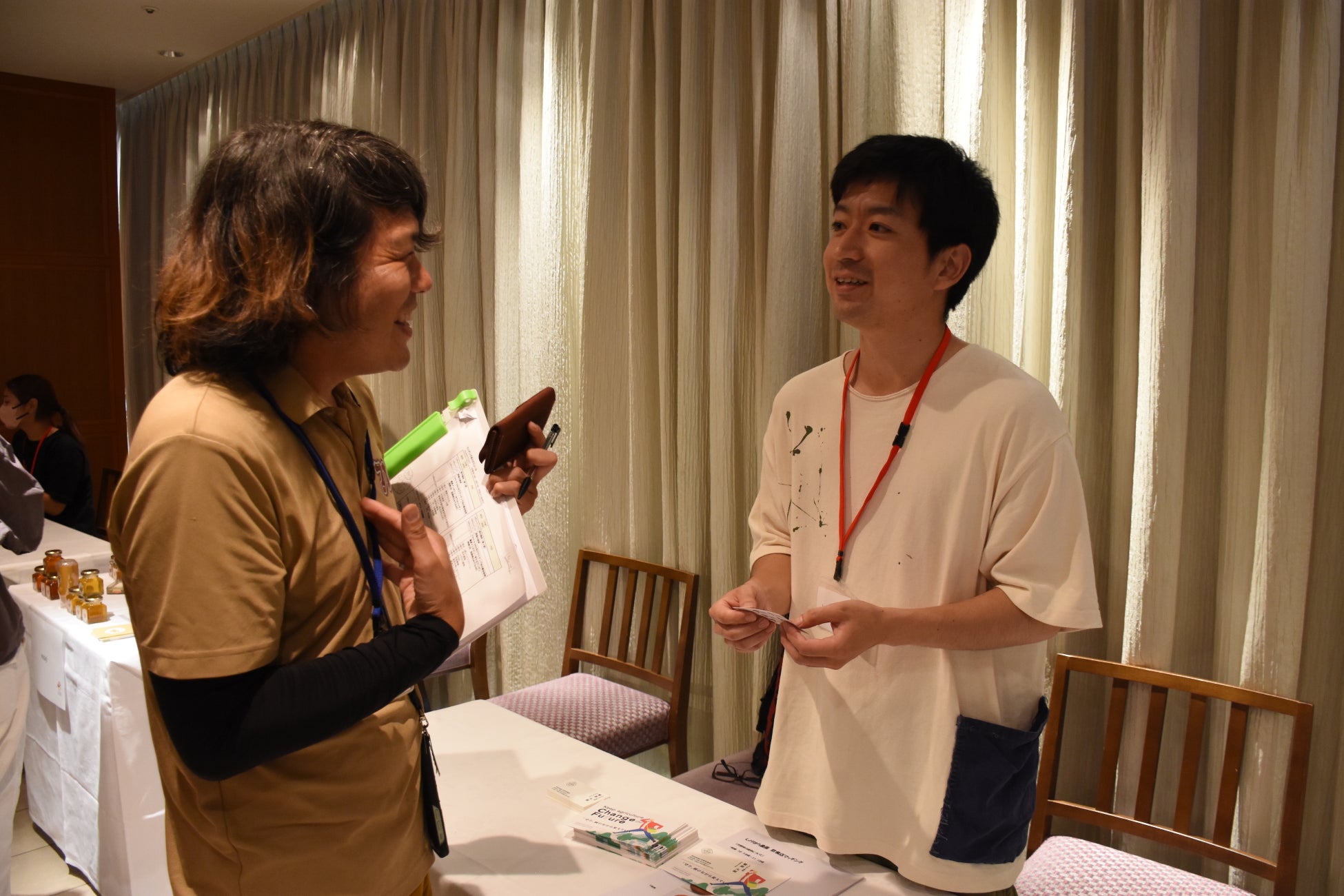プレゼン後は個別の交流タイムです。飲食店側が各生産者のブースへと足を運び、収穫時期や具体的な納品方法、ロット数などについて聞き取り。また、「大葉のえぐみが出やすい時期はある?」「生の柿を天日干しでドライにするのは大変?」など、実際に店舗で使用するイメージを膨らませながらの質問も飛び交っていました。