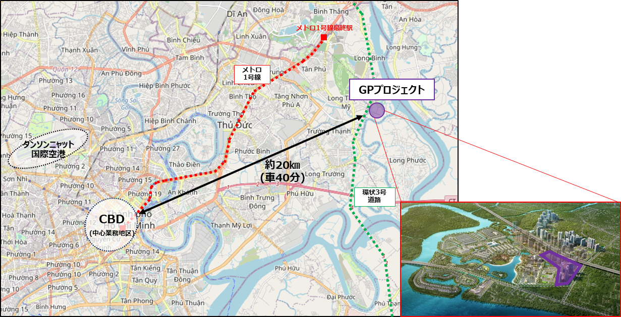 GPプロジェクトは、VH社が進める全体敷地約271haのタウンシップ開発(2026年全区画完成予定)であり、オフィス・住宅・スポーツ施設・商業施設・学校・病院・公園などの都市機能を充実させ、居住人口20万人が集う街を新たに創造するプロジェクトです。ホーチミン市中心部から直線距離で約20㎞、ロンタインハイウェイ・ハノイハイウェイ・環状3号線等の道路ネットワーク整備が進む、交通利便性に優れたエリアに所在します。また、同エリア周辺には大規模なハイテクパークや工業団地が立地し、積極的な企業誘致により入居企業も増えていることから、引き続き人口増加に伴う旺盛な住宅需要が見込まれます。2021年にGPプロジェクト第1期の引渡しが開始し、住民の入居や店舗のオープンが進むなど、順調に街づくりが進んでおります。当社が参画する第2期についても、2022年2月より住戸の引渡しを開始しております。