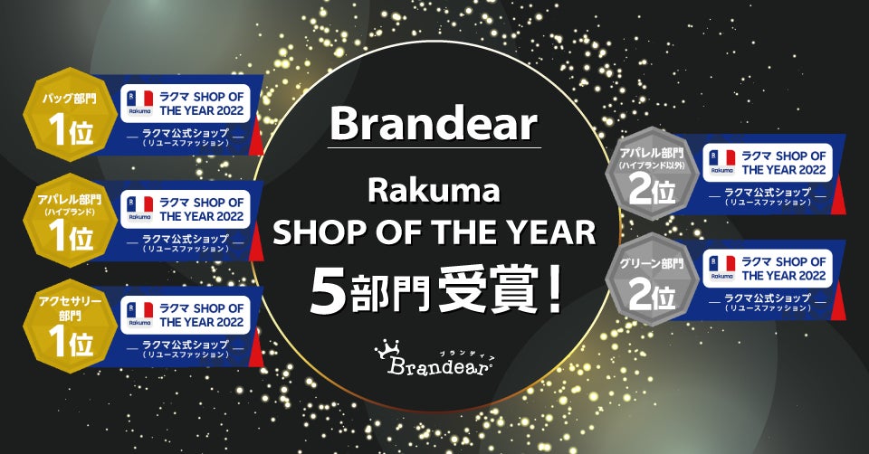 BEENOS株式会社(東証プライム 3328)の連結子会社で、株式会社デファクトスタンダード(本社:東京都大田区、代表取締役社長:仙頭健一、以下「デファクトスタンダード」)が運営するブランド品買取・販売「ブランディア」は、楽天グループ株式会社(以下「楽天」)が運営するフリマアプリの「楽天ラクマ」が初開催する『ラクマ公式ショップ』アワード2022で「アパレル」部門(ハイブランド以外)、「バッグ」部門、「アパレル部門」(ハイブランド)、「アクセサリー」部門、「グリーン」部門の5部門で受賞しました。