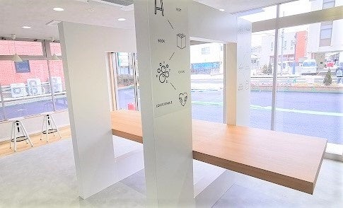 中央をくりぬいた仕切りを用いた「たたみ台」を設置することで、洗濯物をたたむというプライベートで開放的な空間を生み出すことに加え、 with コロナでニューノーマルとなったソーシャルディスタンスにも配慮しています。中央がくりぬかれていることにより、外からでも利用状況が確認できます。また、畳台の仕切りには洗濯可能な衣類を示すアイコンを分子式上に配置するという遊び心も加えています。