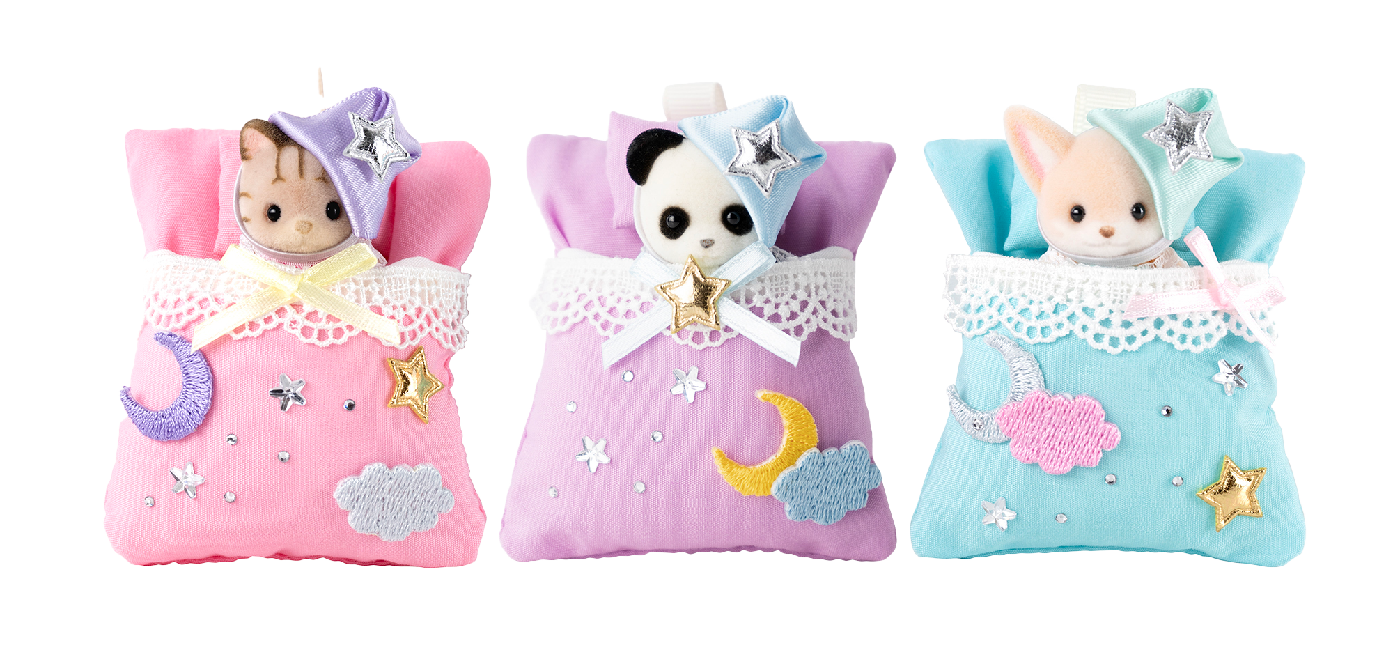 赤ちゃん人形サイズのおふとんが作れるワークショップ。色はパープル、ブルー、ピンクの3色から選べます。帽子を作って、完成済みのおふとんにレースやワッペン、ビーズなどのパーツをデコレーションするだけ。自分だけのおふとんを作って、赤ちゃん人形を入れて持ち歩けます。