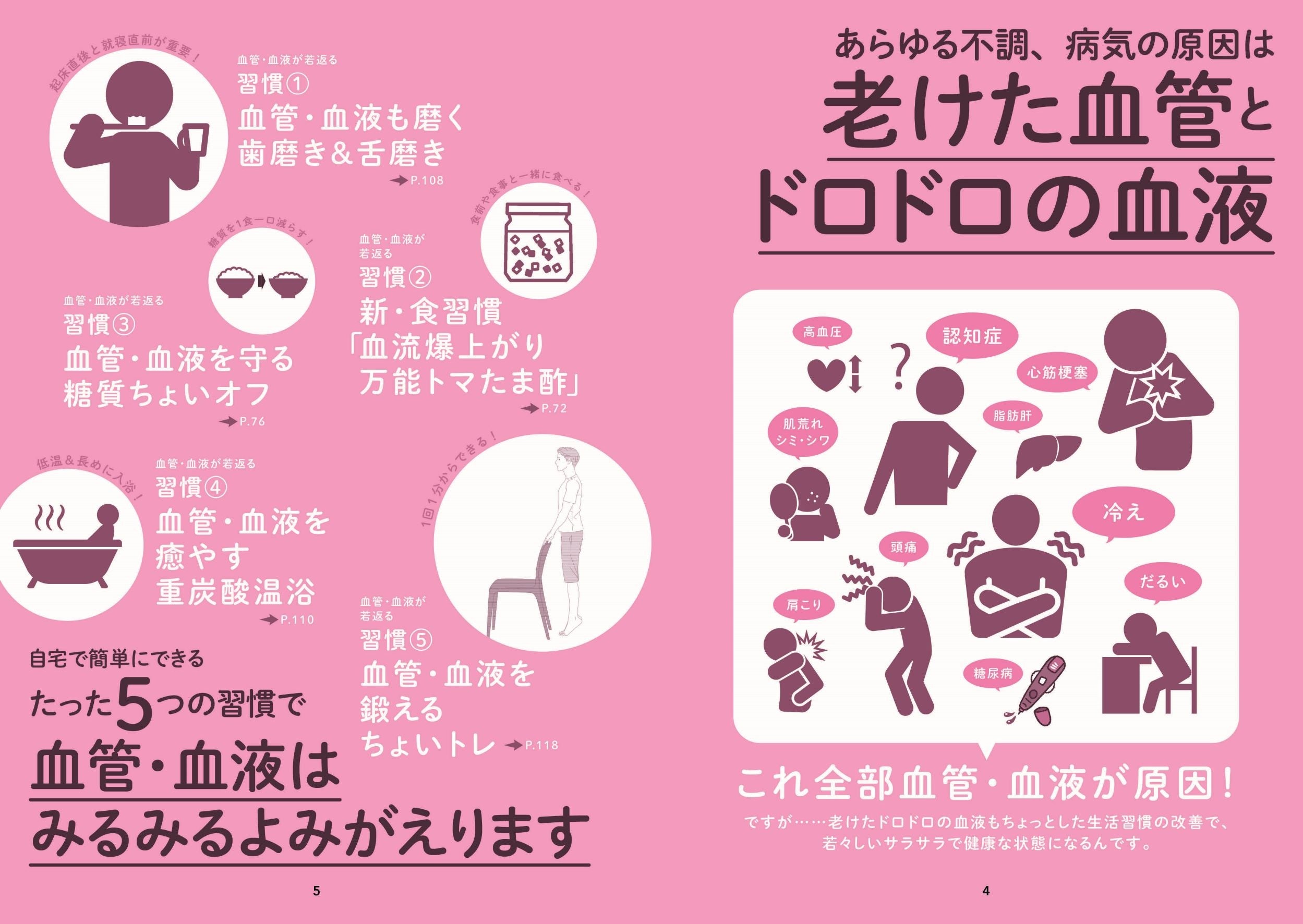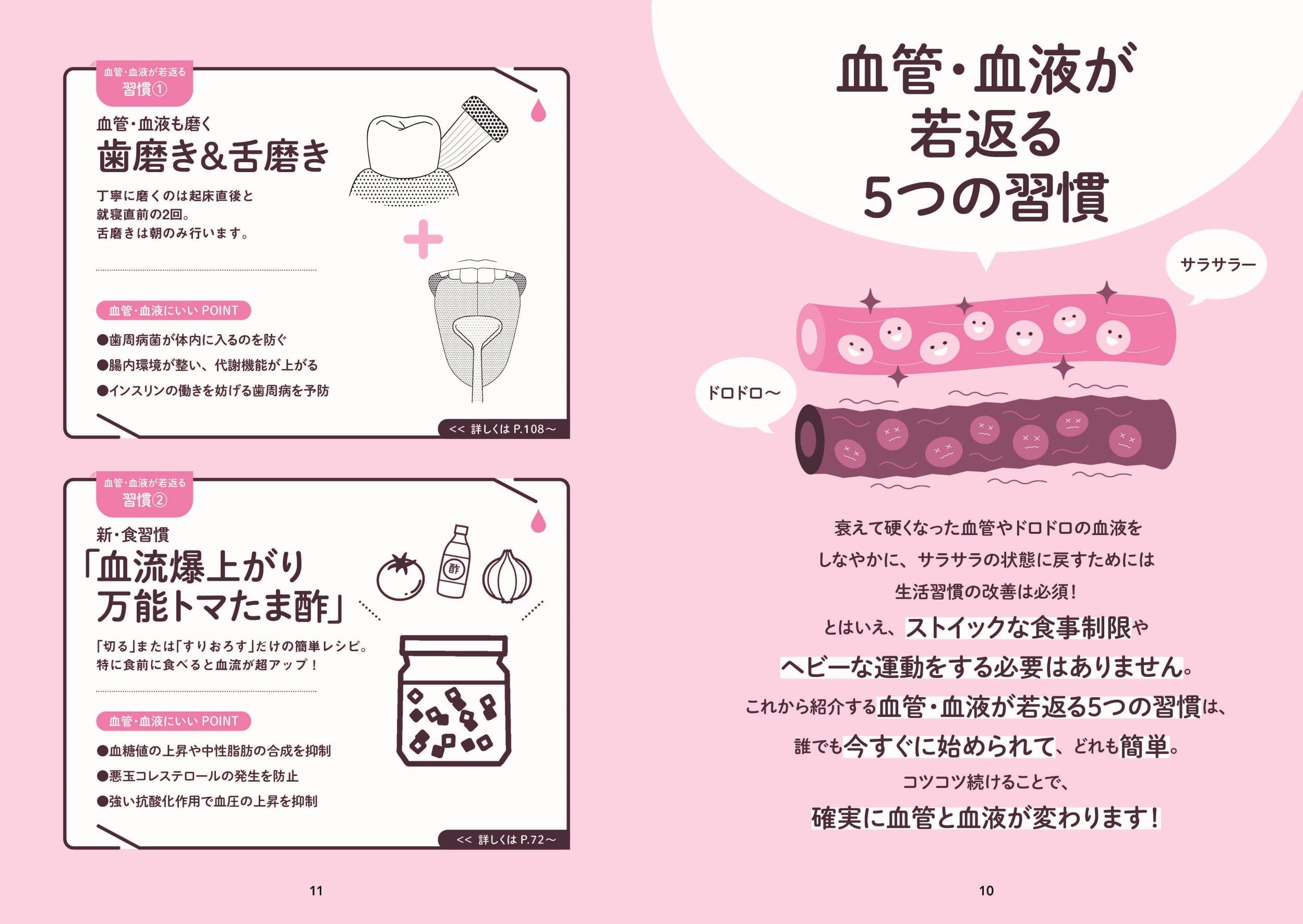 『血液をきれいにする歯磨き』『酢トマトを食べる』など簡単にできて効果絶大なものばかり。血圧、中性脂肪などが高い方をはじめ、いつまでも病気知らずで若々しくいたい方など、あらゆる人に読んで欲しい一冊です。