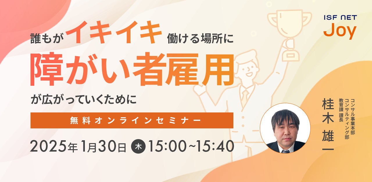 株式会社アイエスエフネットジョイ(本社:東京都中野区、代表取締役:渡邉幸義、以下アイエスエフネットジョイ)は、2025年1月30日(木)の日程にて、「誰もがイキイキ働ける場所に|障がい者雇用が広がっていくために」を開催いたします。