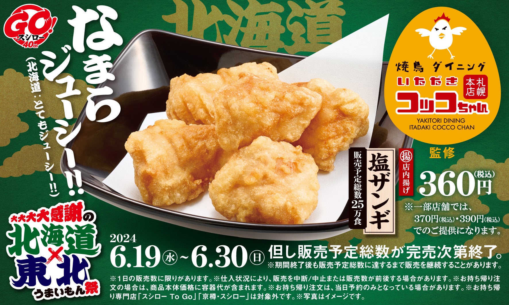 同日より開催している『大大大大感謝の北海道×東北うまいもん祭』では、北海道や東北エリアのおいしいネタや名物もご用意しておりますので、「塩ザンギ」も一緒にお楽しみください。