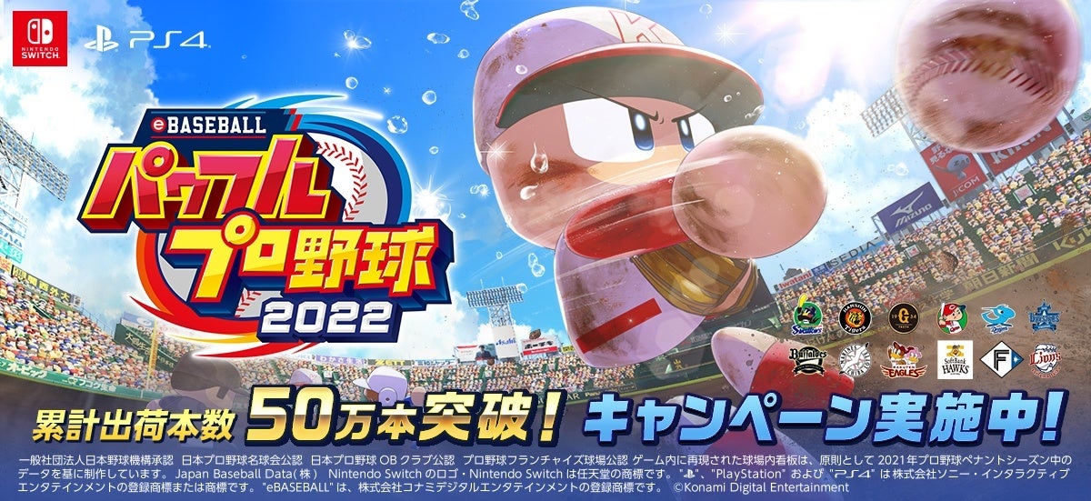 株式会社コナミデジタルエンタテインメントは発売中の『eBASEBALLパワフルプロ野球2022』(Nintendo Switch™、PlayStation®4)が累計出荷本数50万本※を突破したことをお知らせします。