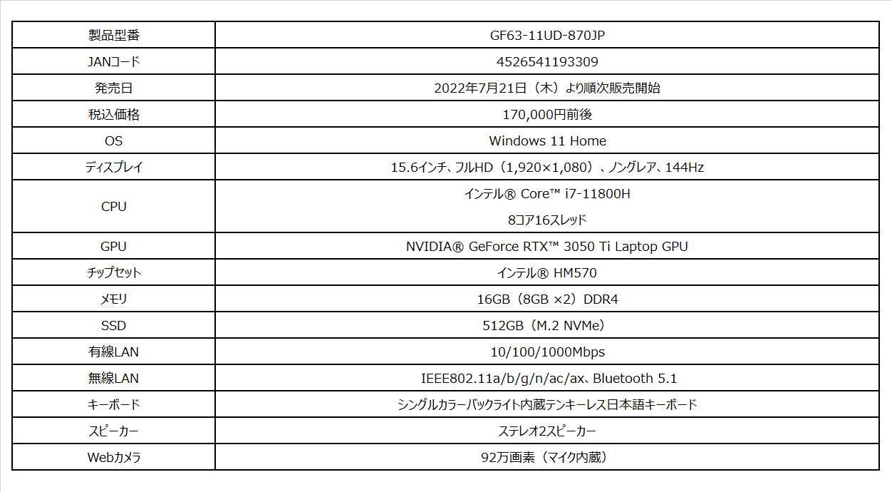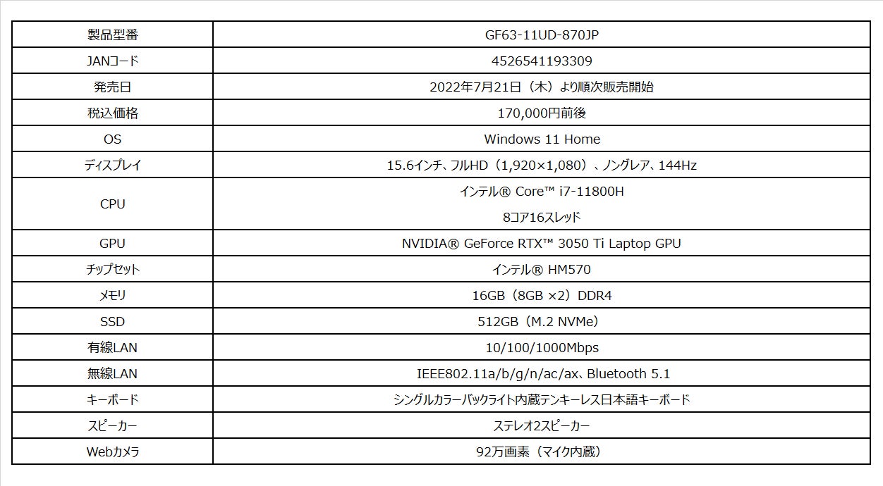 ~薄型・軽量ゲーミングノートPC「GF63-11UD-870JP」も同時発売~