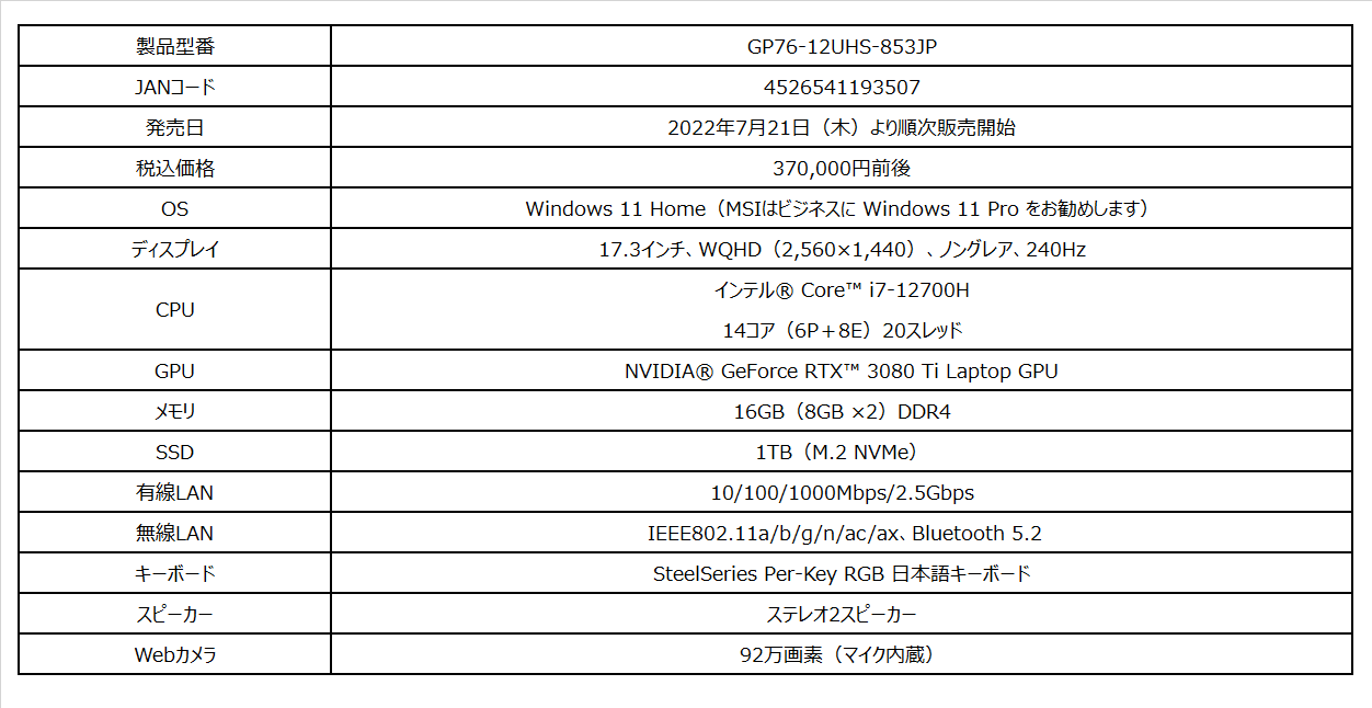 WQHD解像度ゲーミング向けの性能と機能を追求したハイエンドモデル 「GP76-12UHS-853JP」を2022年7月21日(木)より発売